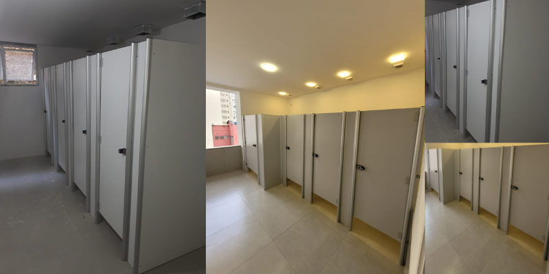 • Ausência de cuidados adequados: A falta de cuidados e manutenção adequada também pode causar danos às divisórias. Em especial por estarem instaladas em espaços úmidos, é necessário cuidados de higiene, impermeabilização, manutenção adequadas das ferragens e substituição de peças em caso de danos.
